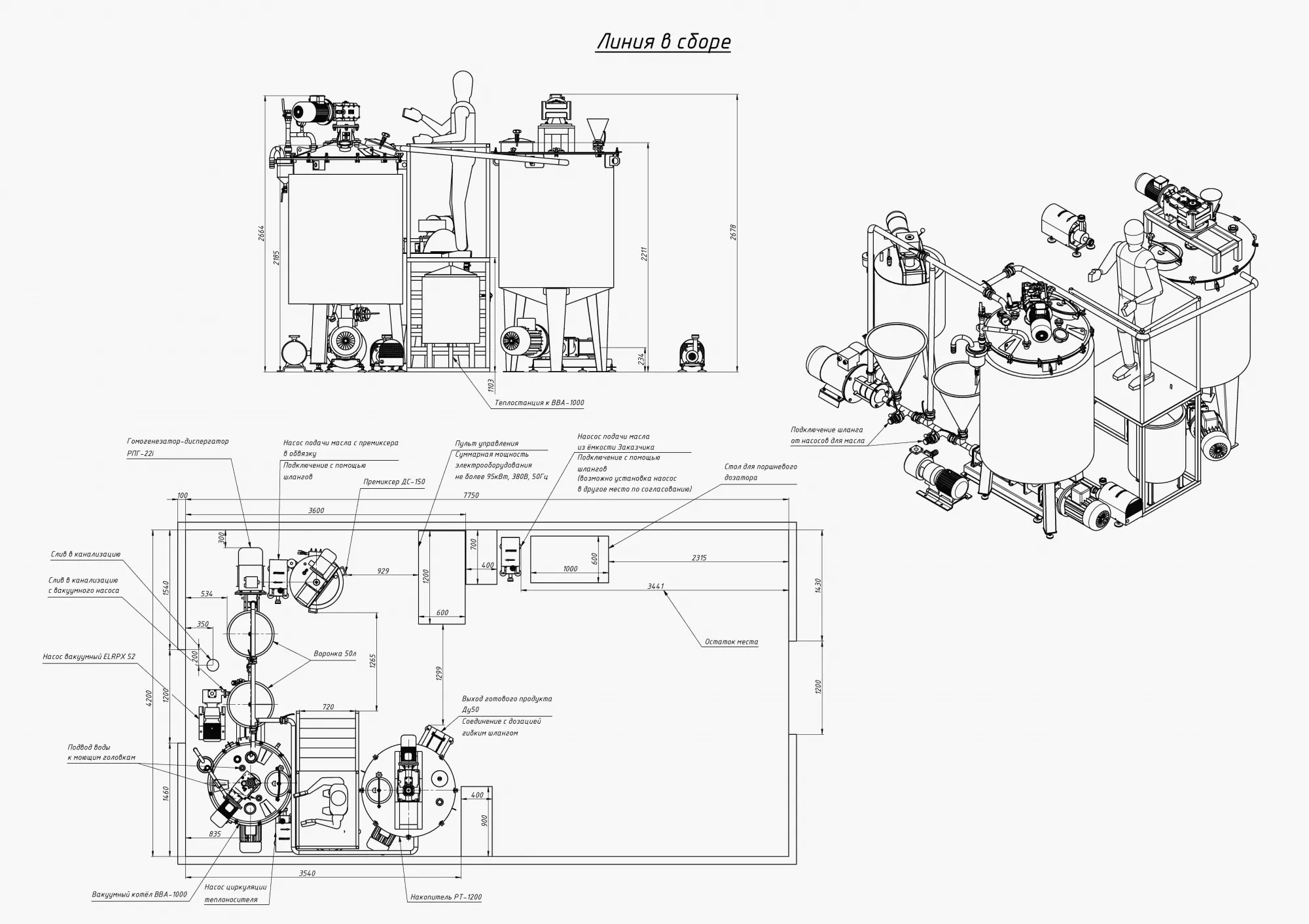 Емкость трехслойная 150л из пищевой нержавеющей стали AISI304, с термоизоляцией, с коническим дном, на сливе дисковый затвор Ду 50 мм. Емкость с рубашкой под теплоноситель (вода_ со встроенными ТЭНами суммарной мощностью 12 кВт (2 блока по 6 кВт), 1/3 крышки подъемная, датчик температуры в продукт и в рубашку. Перемешивающее устройство – пропеллерного типа 1,5 кВт, 284 об./мин. Моющая головка. Дно коническое.