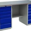 Верстак состоит из 2 тумб WD1 и WD5. WD1 Тумба укомплектована 2-мя съемными регулируемыми полками и 1 дверцей, возможность смены стороны открывания двери. Ключевой замок на дверце тумбы. Нагрузка на полку 30 кг. WD5 Тумба укомплектована 5-ю выдвижными ящиками. Ящики открываются на телескопических направляющих. Нагрузка на ящик 30 кг. Все ящики закрываются на центральный ключевой замок
